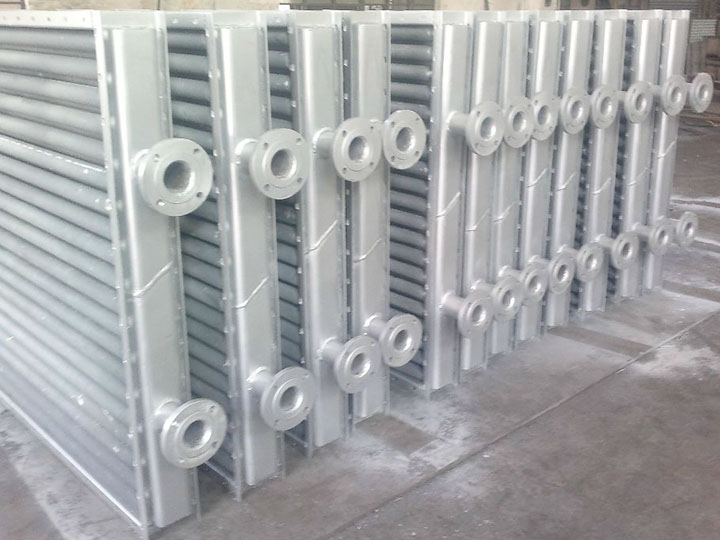 翅片式換熱器主要用于干燥系統(tǒng)中空氣加熱,是熱風裝置中的主要設(shè)備,散熱器采用的熱介質(zhì)可以是蒸汽或熱水,也可用導熱油,蒸氣的工作壓力一般不超過0.8Mpa,熱空氣的溫度在150℃以下。