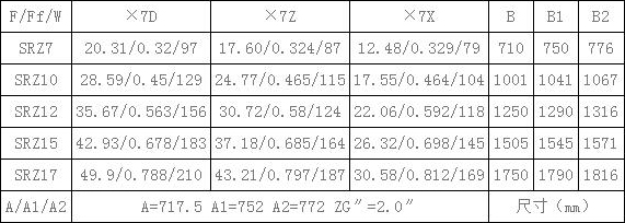 表4、SRZ空氣熱交換器(散熱器)散熱面積F(m2),通風(fēng)凈截面積Ff(m2),參考重量W(Kg),有關(guān)尺寸(mm)一覽表